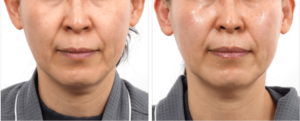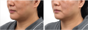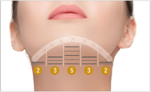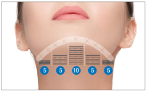 Bu çalışmada, MP modlu tek bir HIFU cihazı (Ultraformer MPT: Classys, Inc., Seul, Kore) kullanılmıştır. Klinik uzman, submental yağa 4,5 mm ve 6,0 mm olmak üzere iki farklı kartuşla 100 ve 120 atış (0,5J/0,7J) yapmıştır. Tüm hastalara, 30-40 dakika süreyle topikal anestezik krem uygulanarak tek seanslık bir tedavi uygulanmıştır. Mandibular sinire zarar vermemek için tedavi alanında mandibular sinir boyunca 1,0 cm’lik bir alan korunmuştur (Şekil 1). Ayrıca, sinerji etkisi ve sıkılaştırma amacıyla çene hattında normal modda 4,5 mm’lik kartuşla 30 atış (0,7J) yapılmıştır (Şekil 2). Ortalama olarak toplamda 250 atış yapılmıştır.