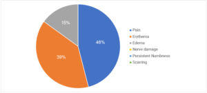 BULGULAR 4 hafta süren çalışmaya toplam 30 hasta katılım gösterdi. Tedavi gören hastaların görünüşlerinden memnuniyet oranı yüksek bulunmuş ve submental yağda önemli bir azalma kaydedilmiştir. CR-SMFRS sonuçlarına göre, tedavi sonrası 10 hafif hasta, 10 orta hasta, 8 ciddi hasta, 2 aşırı ciddi hasta varken, bir tedavi seansı sonrasında bu oranlar 16 hafif, 8 orta, 5 ciddi ve 1 aşırı ciddi olarak değişmiştir. Önemli iyileşme kaydedildi, p<0.000005. SSRS %82 idi (İyileşme Seviyesi) ve ayrıca hastaların çoğunda hemen iyileşme görüldü. Önemli yan etki veya olumsuz etki bildirilmedi. Beklenen yaygın yan etkiler kaydedilmiş olup, bu etkiler 2 hafta içinde düzelmiştir.