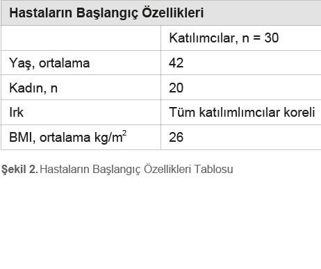 Bu çalışmaya 30 Koreli hasta katıldı (Tablo 1). Katılımcılar, CR-SMFRS ölçeğine göre (0’dan 4’e kadar, yoktan aşırıya) ve submental yağlarına dair kendi memnuniyet düzeylerini SSRS (katılımcının kendi kendini değerlendirme ölçeği, 0’dan 3’e kadar) kullanarak genel değişiklikleri ve memnuniyet seviyelerini tanımlayarak çalışmaya uygun bulunmuştur. Keloid skar ya da gebelik geçmişi olan, tedavi alanında açık yara veya lezyonlar, cilt enfeksiyonları, hemorajik bozukluk ve vücut BMI’si >35kg/m2 olan hastalar değerlendirme dışında tutuldu. Ayrıca, kilo verme programlarına katılmış olan veya diyet yapmayı planlayan hastalar da değerlendirme dışında tutuldu. Tüm hastalardan onam formu alındı, hastalar beklenen sonuçlar, olası yan etkiler ve olumsuz etkiler hakkında bilgilendirildiler. Bu çalışmanın protokolü Helsinki Bildirgesi (1975) yönergelerine uyumludur. Tedavi sonrası hemen dahil olmak ü
