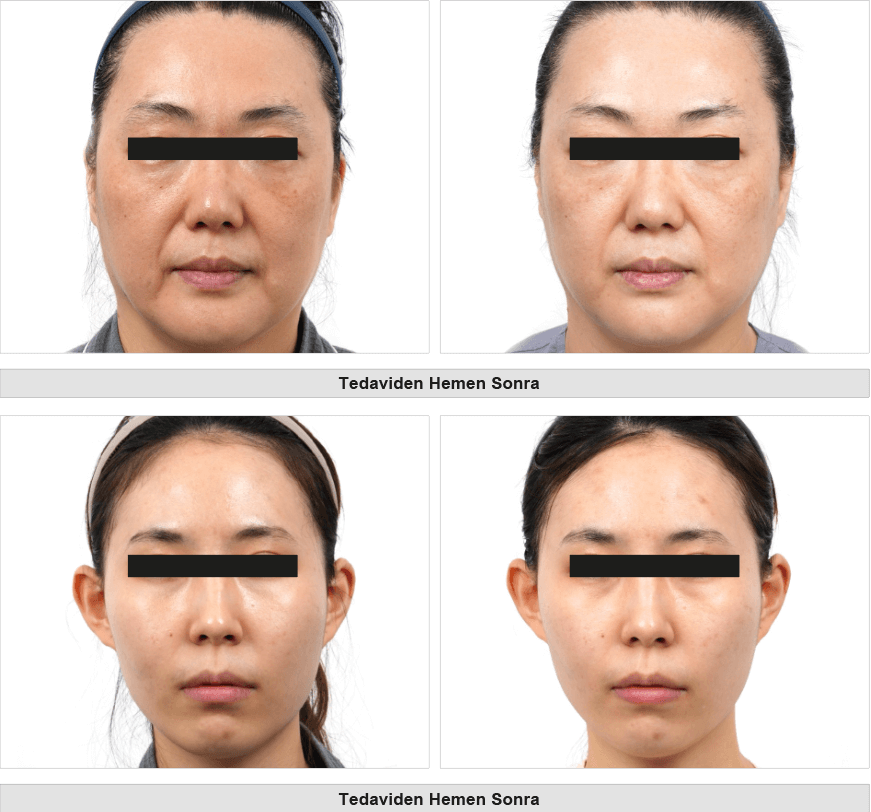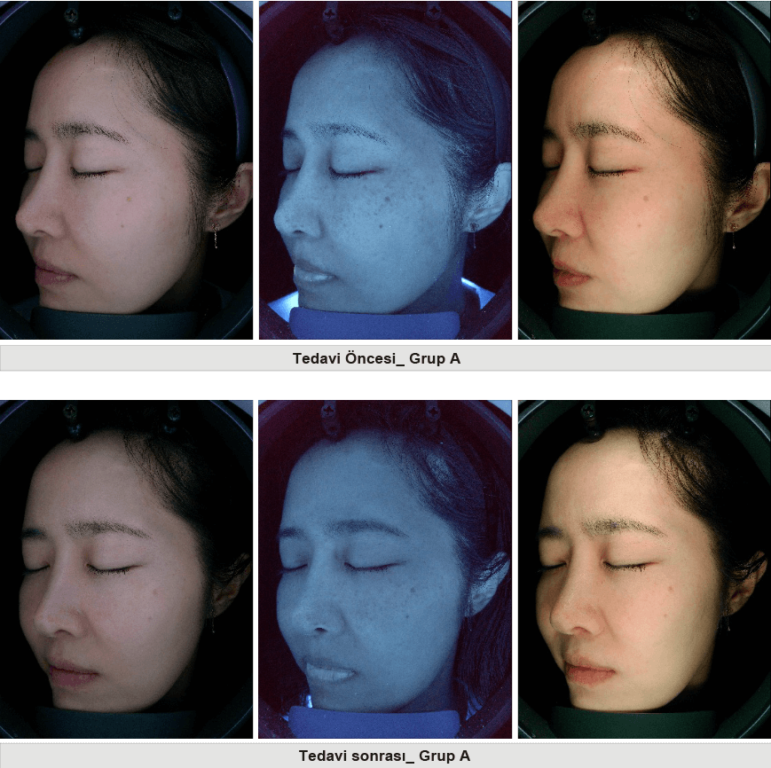 Dijital fotoğraflar (EOS Rebel SL3, Canon Inc., Japonya) çekildi ve tedavi memnuniyetine ilişkin hasta anketleri (1 ila 4 ölçeğinde) uygulandı. İnce kırışıklıklar, hiperpigmentasyon ve nemlilik, çok işlevli bir görüntüleme sistemi olan A-One Smart™ (BOMTECH Inc., Güney Kore) ile ölçüldü. Cilt aydınlatma etkileri, Global Estetik İyileşme Ölçeği (GAIS Scale) ile değerlendirildi ve bir doktor tarafından 1 ile 5 arasında bir ölçek kullanılarak analiz edildi.