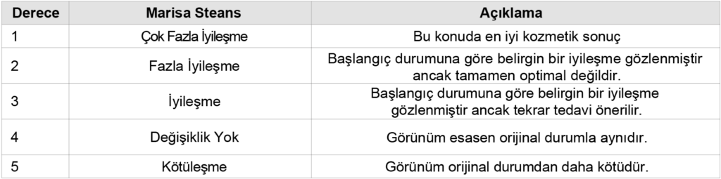 İkinci tedavinin ardından her iki grubun dijital fotoğrafları ve çok işlevli görüntüleme sistemi fotoğrafları çekildi. Katılımcıların memnuniyeti 1–4 ölçeğinde ölçüldü (1 = iyileşme yok, 2 = minimum iyileşme, 3 = fark edilebilir iyileşme, 4 = belirgin iyileşme). Hastalardan şu cilt özelliklerindeki değişiklikleri değerlendirmeleri istendi: aydınlanma, ince çizgiler, hiperpigmentasyon ve nemlilik. Bir hekim, çekilen fotoğraflardaki aydınlanma etkisini GAIS Ölçeği kullanarak değerlendirdi.