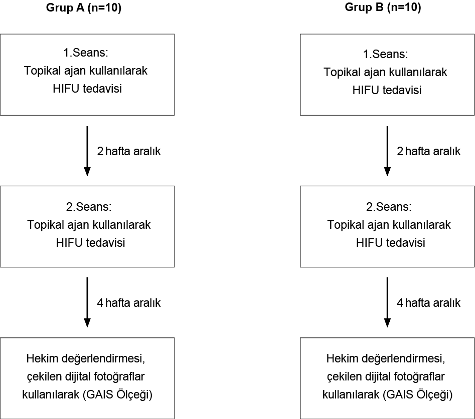 YÖNTEM: Yaşları 30-55 arasında değişen yirmi kadın gönüllü rastgele iki gruba ayrıldı. Grup A (n = 10), glutatyon ve hyaluronik asit içeren bir topikal ajan kullanılarak iki seanslık non-invaziv HIFU (yüksek yoğunluklu odaklanmış ultrason) tedavisi yapıldı. Grup B (n = 10), HIFU tedavisi uygulanmaksızın aynı topikal ajan kullanılarak iki seanslık tedavi yapıldı.