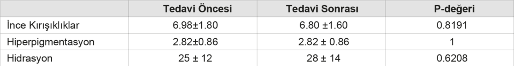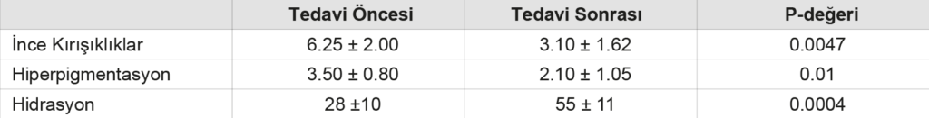 BULGULAR: Grup A’da, üç tedavi sonrasında ince kırışıklıklar, nemlilik ve hiperpigmentasyonda kayda değer iyileşmeler gözlemlendi (P < 0.05). İnce kırışıklıklar 6.25 ± 2.00 mm’den 3.10 ± 1.62 mm’ye düştü. Hiperpigmentasyon 3.50 ± 0.80 mm’den 2.10 ± 1.05 mm’ye azaldı. Nemlilik 28 ± 10’dan 55 ± 11 mm’ye yükseldi. Hastaların yarısından fazlası, tedavi sonrasında cilt aydınlanması, ince çizgiler, hiperpigmentasyon ve nemlilikte belirgin bir iyileşme olduğunu bildirdi. Herhangi bir komplikasyon rapor edilmedi.Grup B’de ise klinik cilt özelliklerinde istatistiksel olarak anlamlı bir değişiklik gözlemlenmedi.