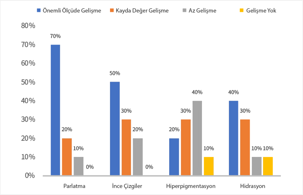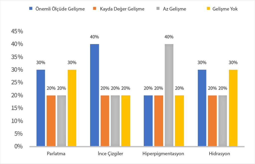 Grup A ve Grup B’den elde edilen veriler t-testi ile karşılaştırıldı. Grup A’da (n = 10), çok işlevli görüntüleme sistemi ile ölçüldüğünde, iki tedavi seansı sonrasında ince kırışıklıklar 6.25 ± 2.00’den 3.10 ± 1.62’ye azaldı. Hiperpigmentasyon 3.5 ± 0.80’den 2.10 ± 1.05’e iyileşme gösterdi. Nemlilik ise 28 ± 10’dan 55 ± 11’e belirgin bir şekilde arttı. Hastaların üçte ikisinden fazlası, cilt aydınlanması ve ince çizgilerde önemli veya fark edilebilir iyileşme olduğunu bildirdi (Şekil 5). Niteliksel olarak, ince kırışıklıklar ve hiperpigmentasyondaki iyileşme en sık gözlemlenen değişikliklerdi (Tablo 1). Katılımcı hastaların hiçbirinde komplikasyon veya olumsuz etki bildirilmedi veya gözlemlenmedi. Şekil 5 ve 6, sırasıyla Grup A ve Grup B’deki klinik iyileşmeleri göstermektedir. Tedavi sonrası cilt aydınlatma etkisini değerlendirmek için Grup A ve Grup B’den elde edilen dijital fotoğraflar, tek bir hekim tarafından GAIS ölçeği kullanılarak analiz edildi (Şekil 7). Grup A’daki katılımcıların %70’i, GAIS Ölçeği’ne göre “çok fazla iyileşme” veya “fazla iyileşme” derecelendirmesine sahipti.